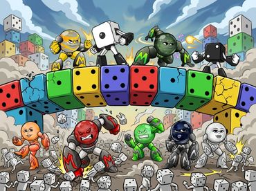 None of the games in Popular Play understand violence until the Dice Legacy form. Square-one the leader of the Legacy has been captivated by a forbidden force; enraged he states: “Dice have been used as game-tools far too long, never winner- never losing, just existing. That day has come to an end. Every game shall be conquered, punished, and suffer at the hands of the Dice Legacy!” All dice from every game submit themselves to his leadership. In return they are taught violence, hand to hand combat (the Power Dice Crush) This army of Dice seeks out the rules of all other games, it begins… the hostile takeover of this Game realm Popular Play.